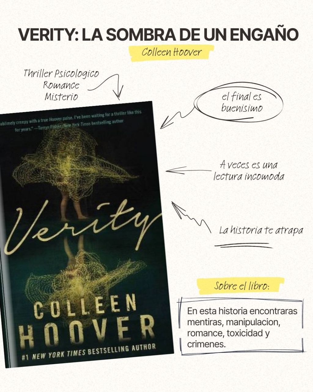Hay libros que te enganchan, y luego está Verity. Desde la primera página, Colleen Hoover no solo te cuenta una historia: te manipula, te provoca y te hace cuestionar todo lo que crees saber de sus personajes.