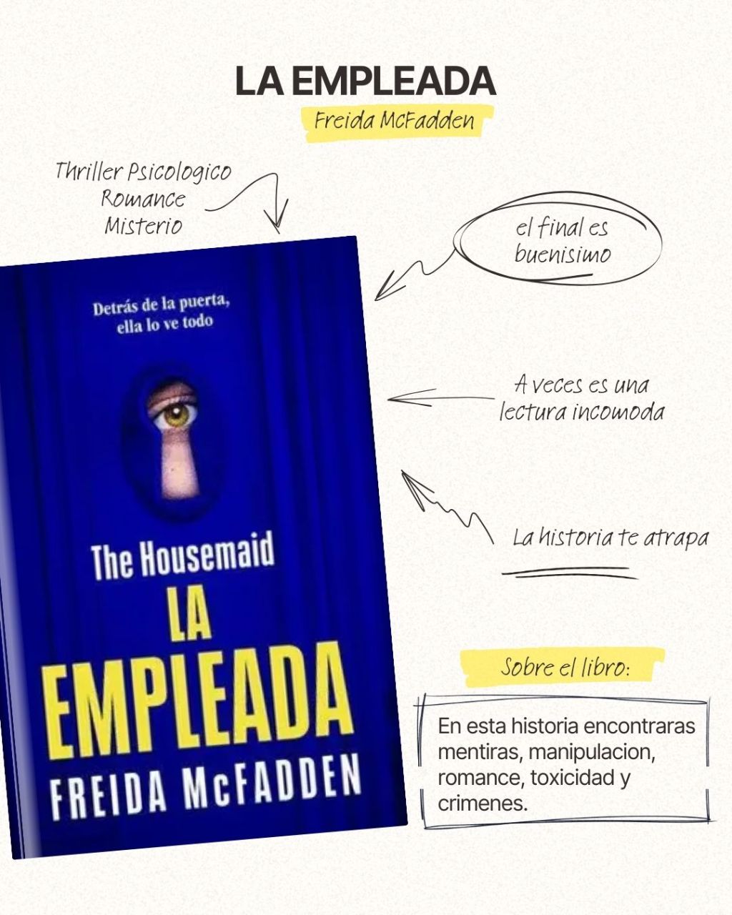 Lo que más me gustó es que Freida McFadden juega contigo todo el tiempo: cuando crees que ya entendiste quién es el villano, la historia se da vuelta y te deja dudando de todo y de todos. Hay secretos, mentiras y manipulaciones que se van acumulando página tras página, y lo mejor es que nunca baja el ritmo. Es de esas novelas que te atrapan porque quieres saber desesperadamente qué va a pasar, pero al mismo tiempo no quieres que se acabe.